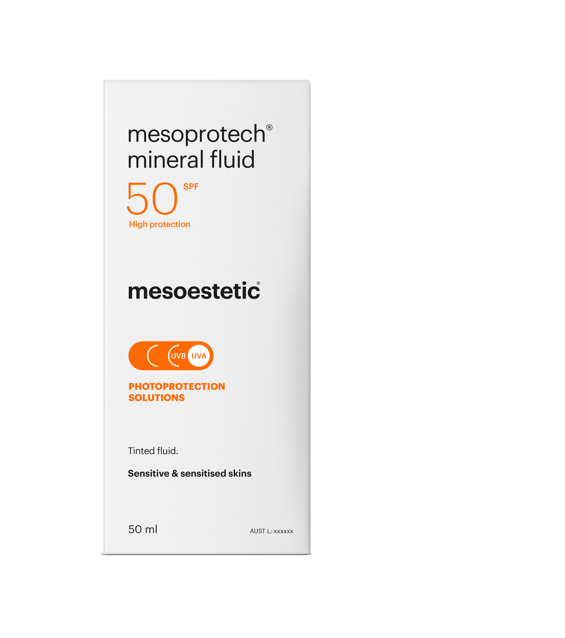 Facial sunscreen with SPF50+ photoprotection for sensitive and sensitised skin and post-treatment. Its fluid texture with colour minimises the white residue.